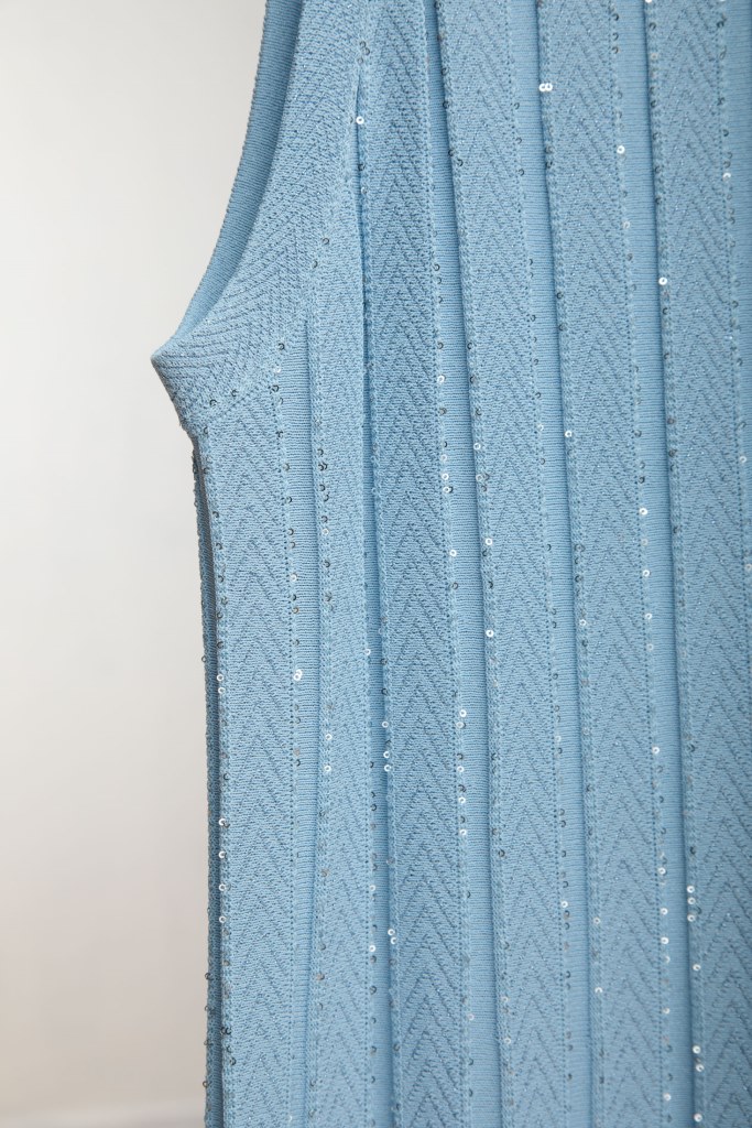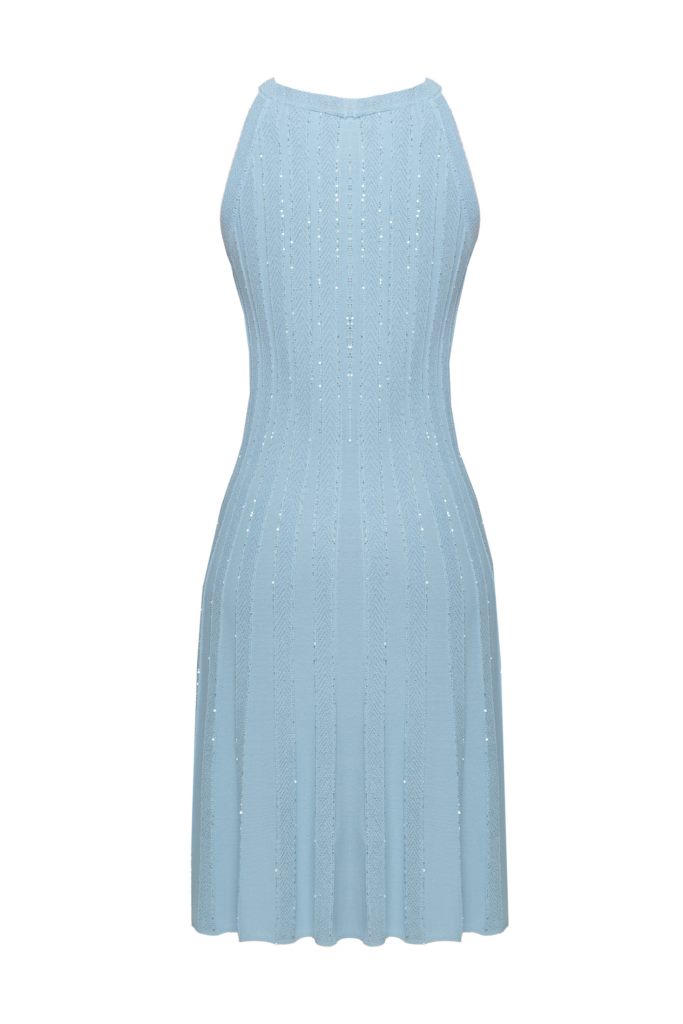 Трикотажна сукя з вирізом в стилі "халтер", що відкриває плечі та додає жіночності. Вона облягає верхню частину тіла, підкреслюючи силует, і розширюється донизу, створюючи легкий образ. Довжина нижче коліна.