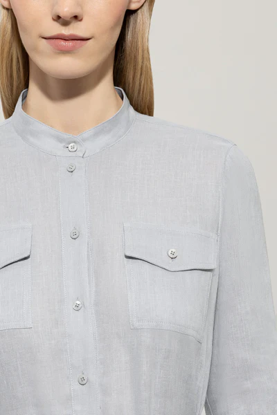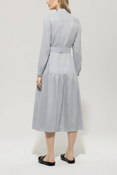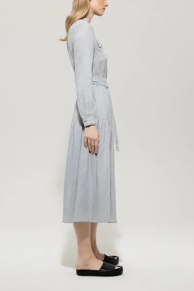 Довга сукня-сорочка з літньої суміші льону та віскози з вузьким коміром-стійкою та застібкою на ґудзики по всій довжині. Сукня доповнена двома накладними нагрудними кишенями, двома потайними боковими кишенями та широким воланом по подолу. Пояс на зав'язках підкреслює талію.