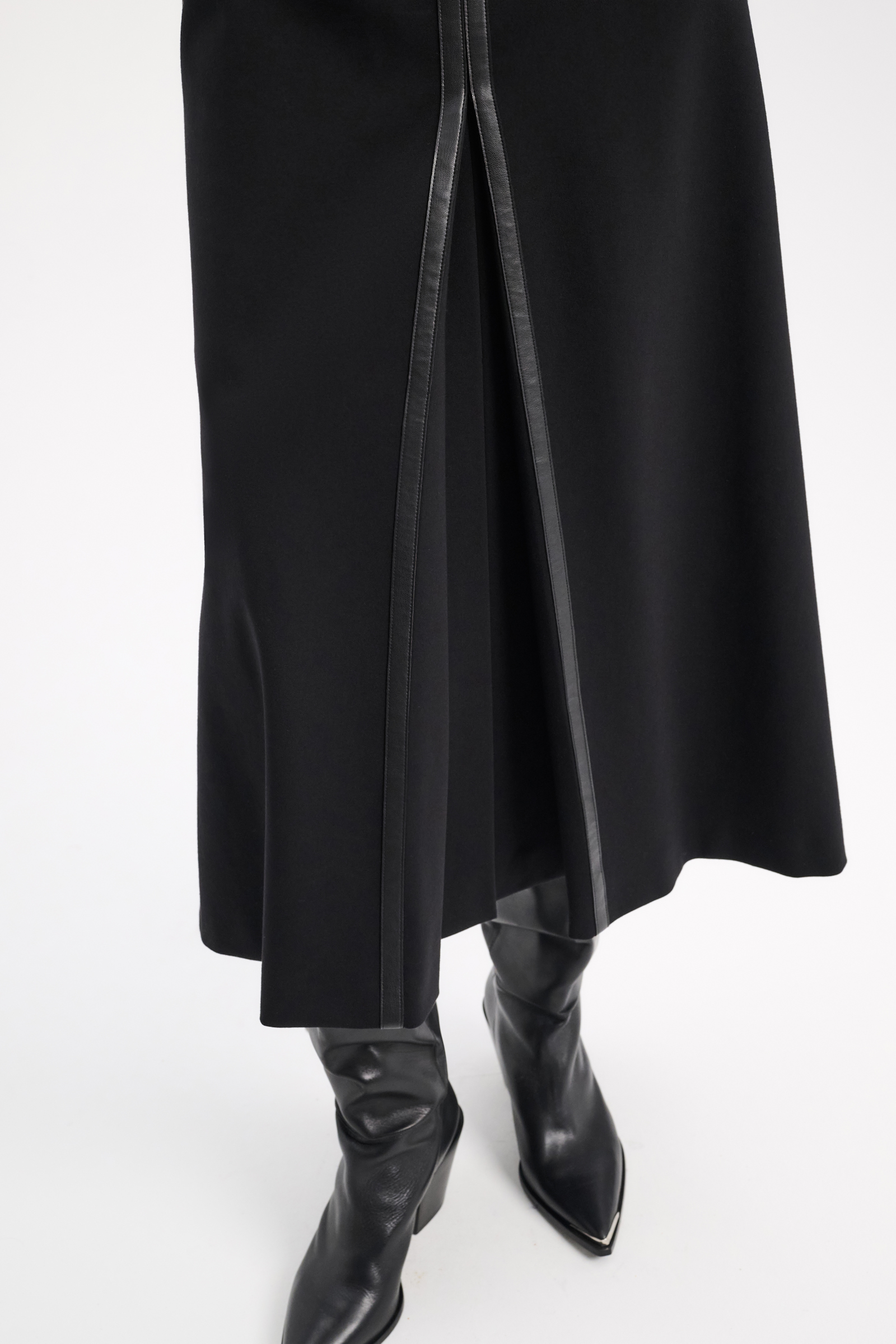 Сукня-футляр виконана з м'якого Punto Milano та оздоблена в тон деталями з еко-шкіри. Розріз спереду регулюється потайною блискавкою.
