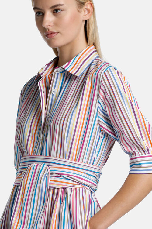 Сукня-сорочка в різнокольорову смужку з чистої бавовни. Комір сорочкового типу, пояс на талії з тканини в тон, рукав 3/4 з манжетами на ґудзиках. Довжина до литок.