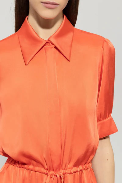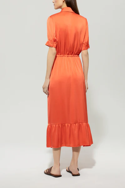 Довга сукня-сорочка з важкого шовку в техніці техно з потайною застібкою на ґудзики та воланом ззаду. Зав'язка на талії майстерно підкреслює жіночний силует.