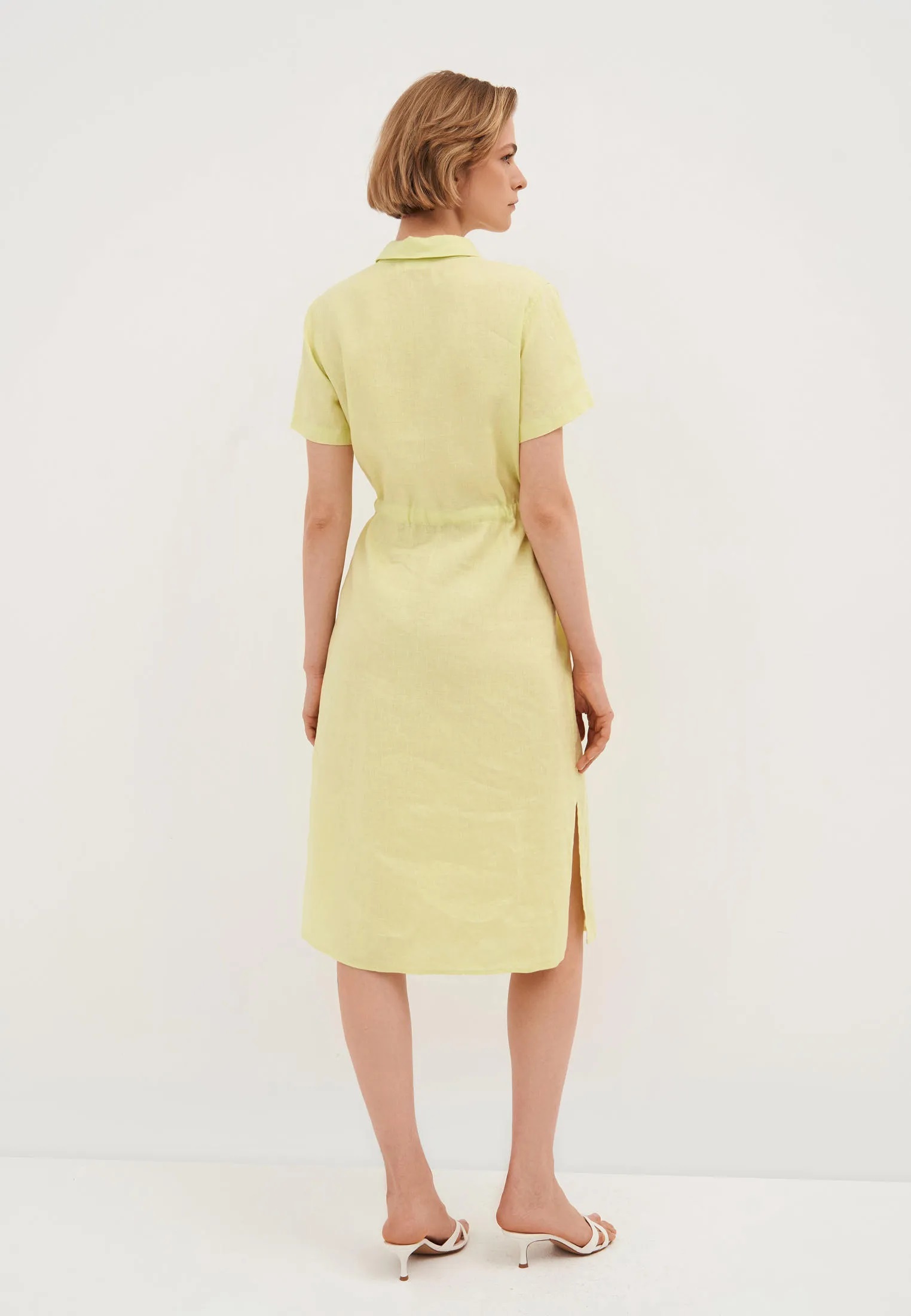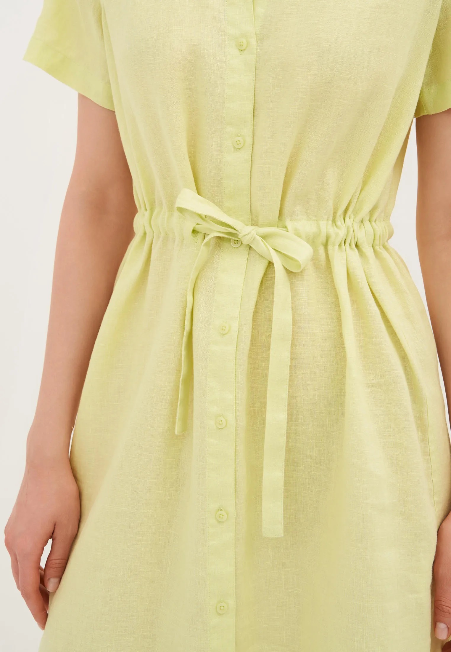 Ця сукня сорочкового крою-ідеальний варіант для літа. Модель з короткими рукавами, класичним комірцем і планкою на гудзиках спереду. Акцент на талії створюється завдяки поясу на зав'язках.
