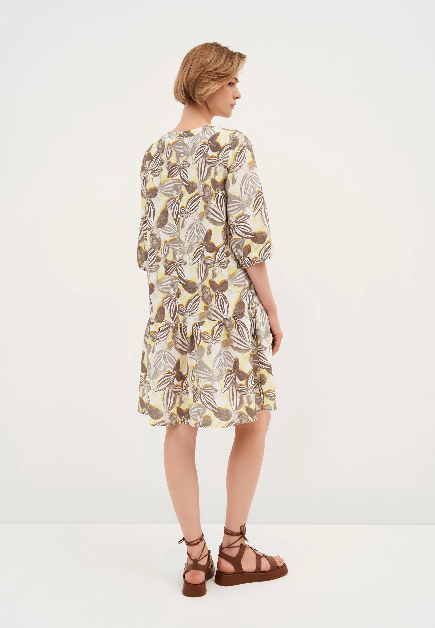 Ця легка літня сукня прикрашена яскравим принтом. Модель має вільний фасон, три чверті рукав і округлий виріз з невеличким розрізом. Низ сукні оздоблений воланом, який створює грайливий та жіночний силует.