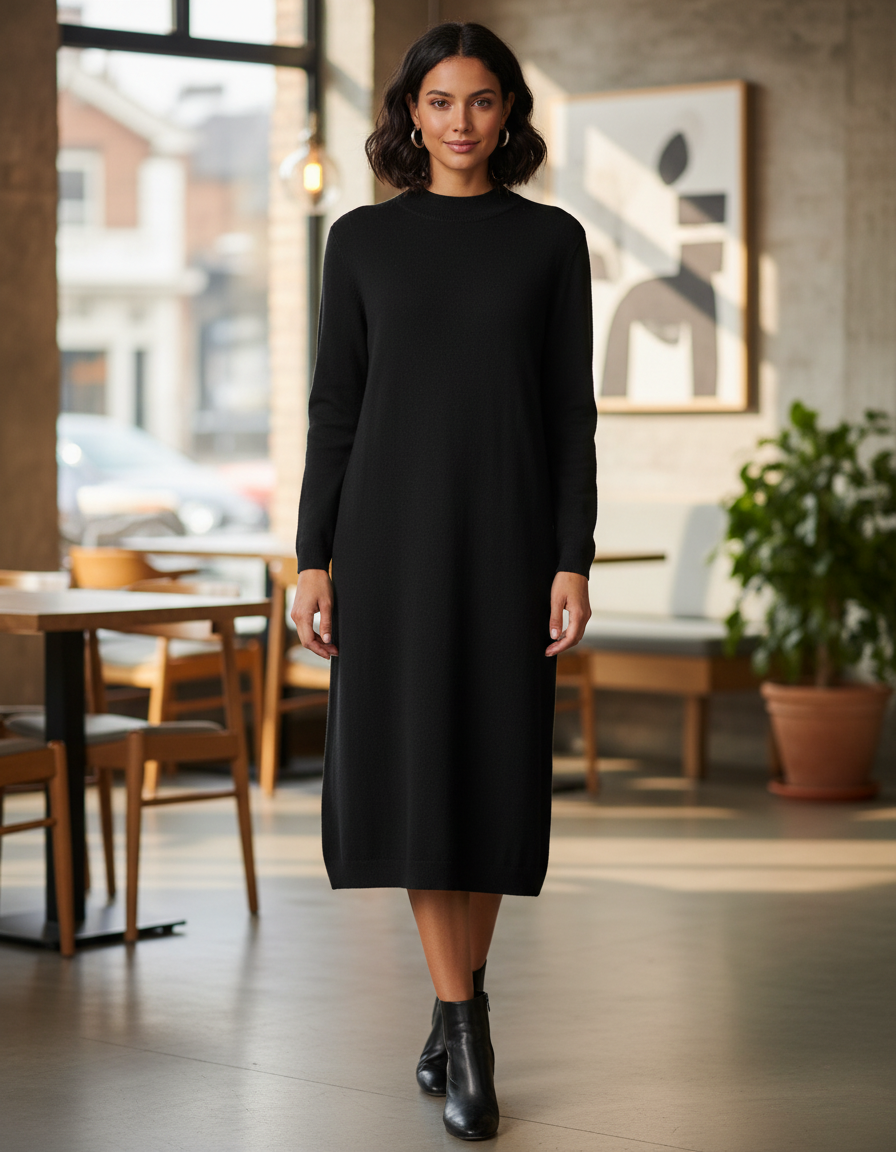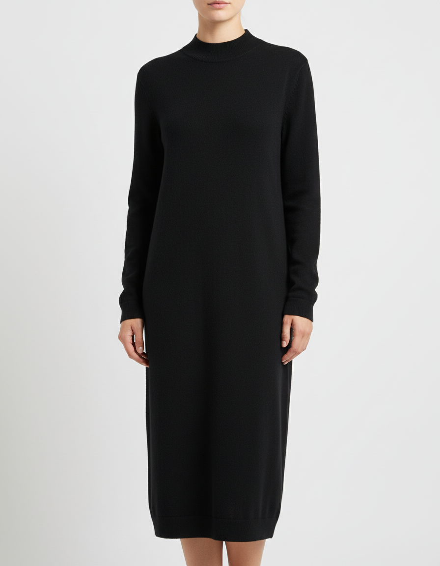 Ця сукня створена з преміальної суміші вовни та кашеміру, що забезпечує неймовірну м’якість і комфорт у носінні. Лаконічний силует прямого крою з довгими рукавами виглядає стримано й елегантно, а високий округлий комір додає образу сучасної мінімалістичної вишуканості.