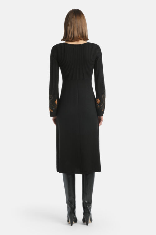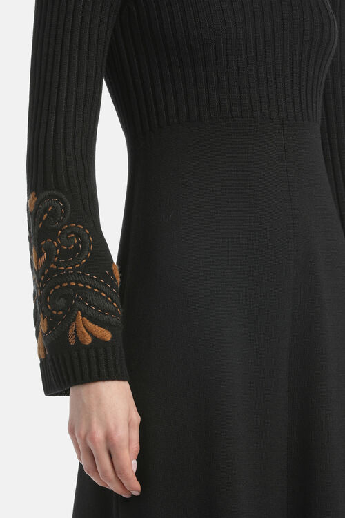 Сукня середньої довжини з гладкої в'язки з чистої натуральної вовни. Має ребристий ліф і рукави, виріз горловини у формі човника, контрастну вишивку Paisley на манжетах. Довжина нижче коліна. Звичайний крій.