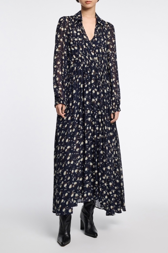 Принтована максі-сукня з марлі вкрита мікро-квітковим принтом і має ніжний комір на зав'язці. Сукня до підлоги має пишний об'єм на подолі та приталені довгі рукави.