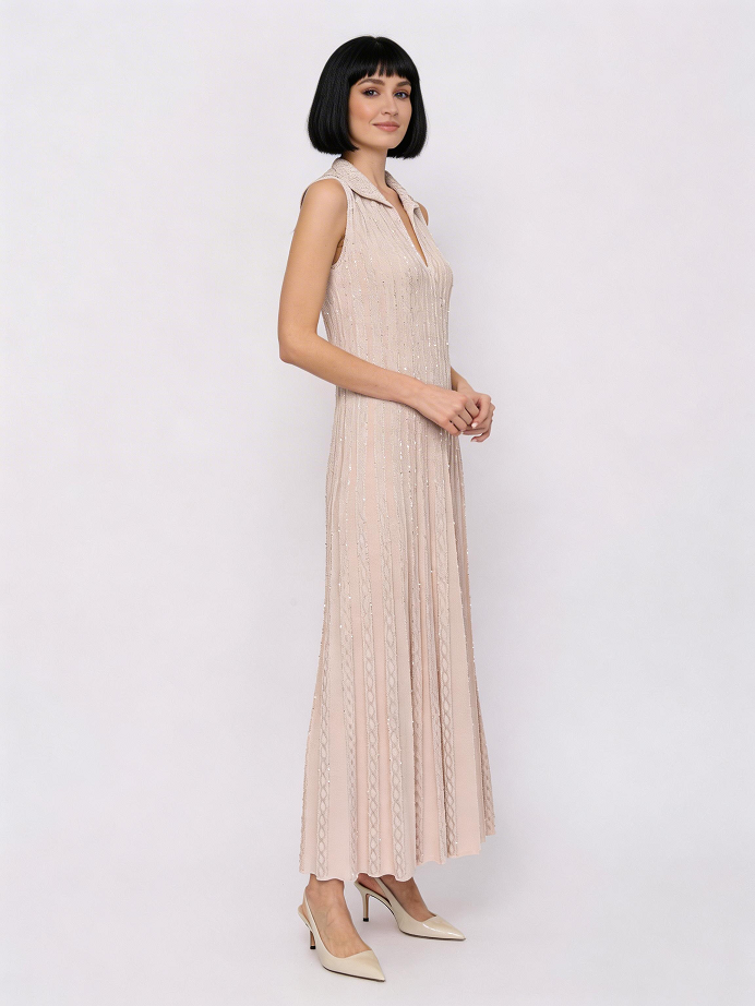 Вечірня сукня в сучасному стилі з глибоким вирізом. Тканина з віскози та паєток облягає груди, а потім розширюється, створюючи гармонійний силует. Комір-поло, що спадає на виразний декольте, ще більше візуально подовжує шию та плечі.