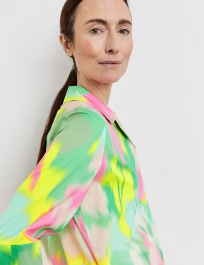 Модель має прямий крій, три чверті рукава та округлий виріз. Основу виробу прикрашає абстрактний принт у ніжних пастельних відтінках, що створює грайливий настрій.