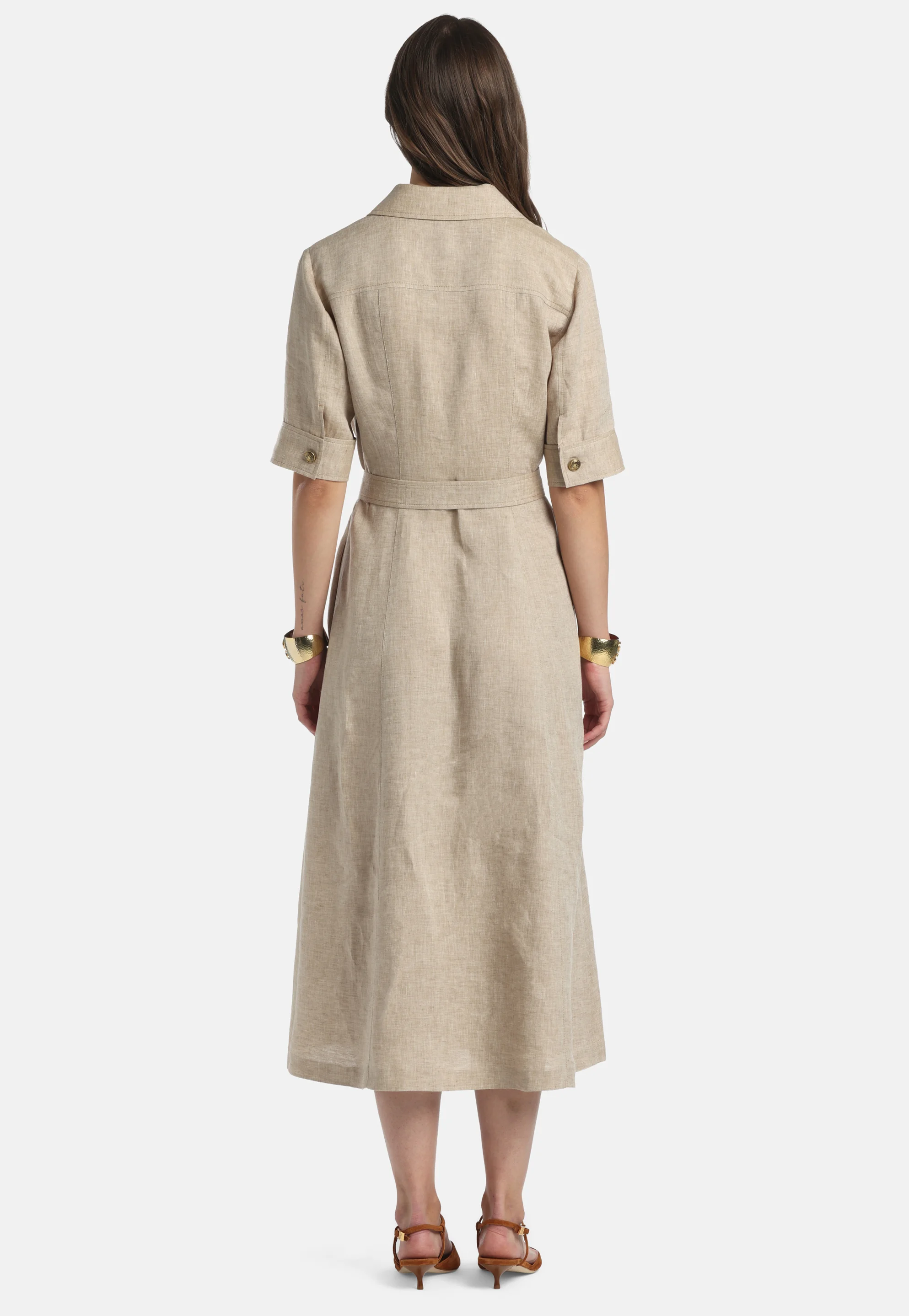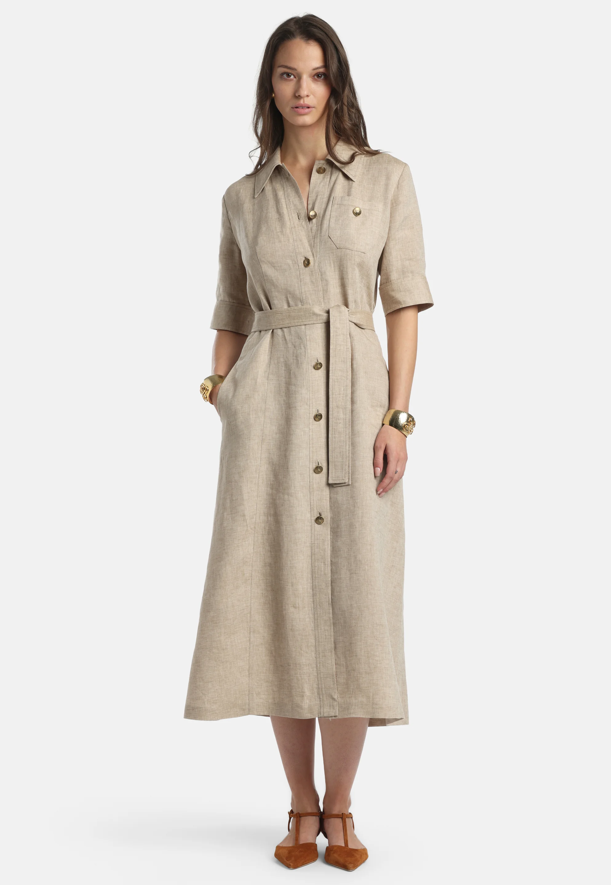 Лляна сукня-сорочка прямого крою з коротким рукавом і класичним коміром. Модель застібається на ґудзики по всій довжині та доповнена поясом, що підкреслює талію.