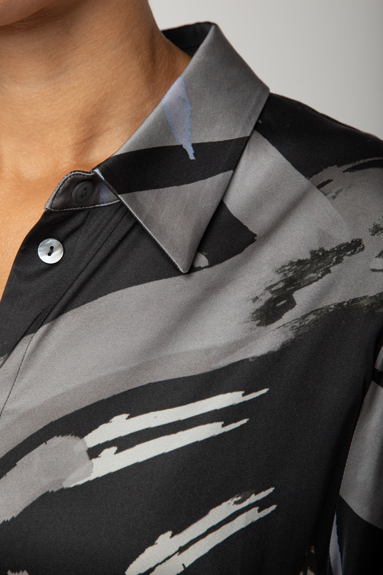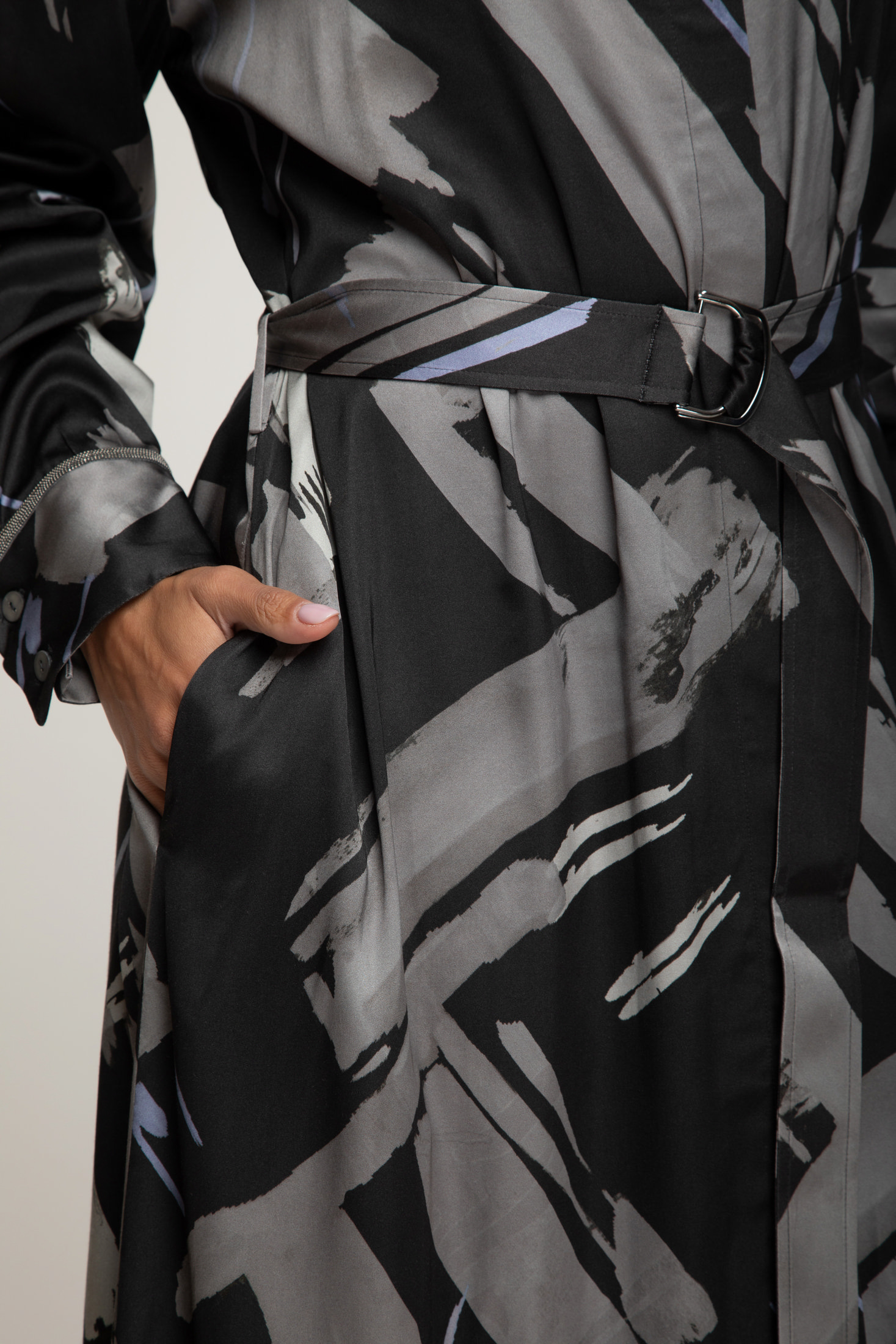 Сукня з віскози з абстрактним принтом. Модель прямого крою з поясом, що підкреслює талію, та довгими рукавами на манжетах. Комір сорочкового типу додає елегантності, а м’яка тканина красиво драпується, створюючи вишуканий силует для щоденних і вечірніх образів.