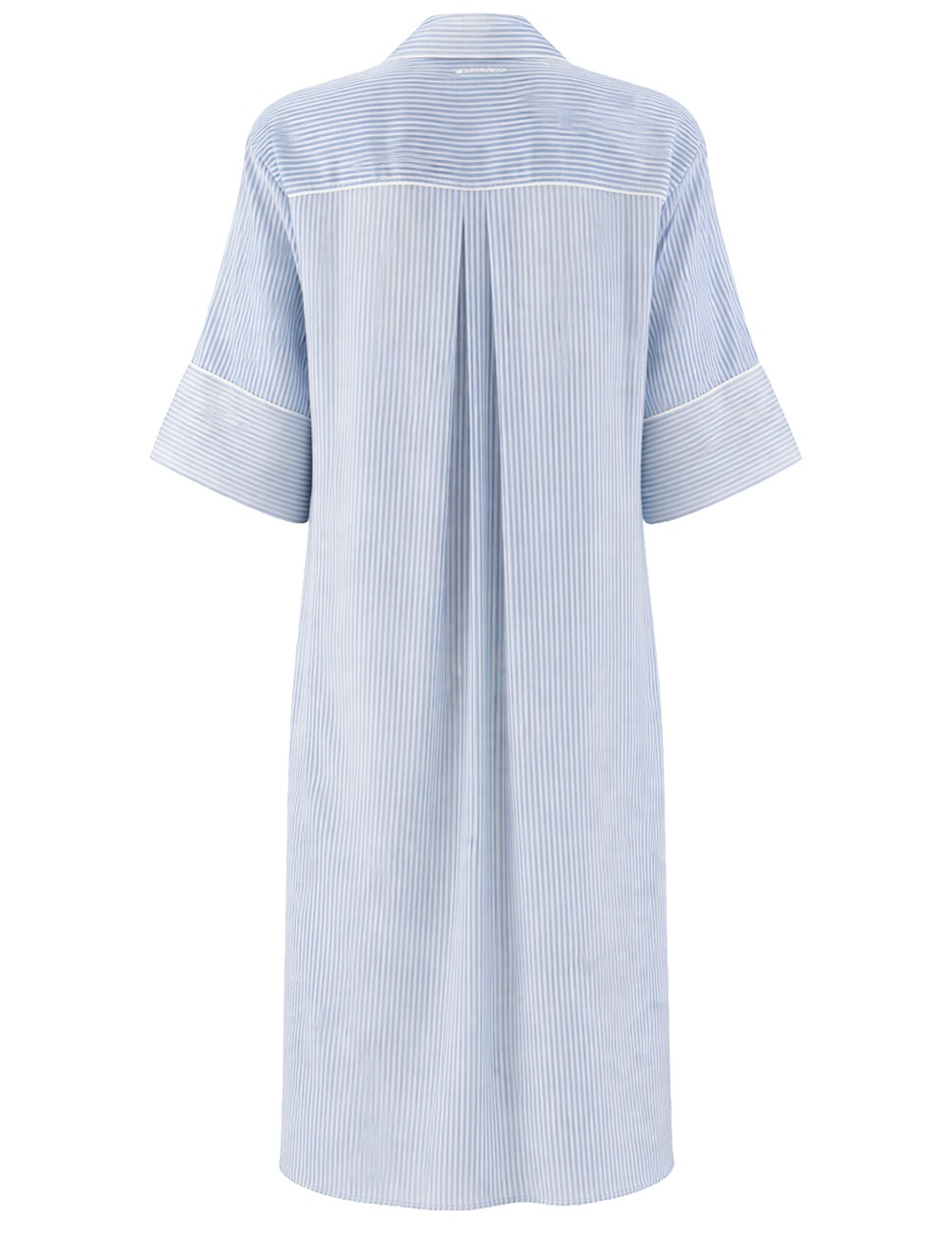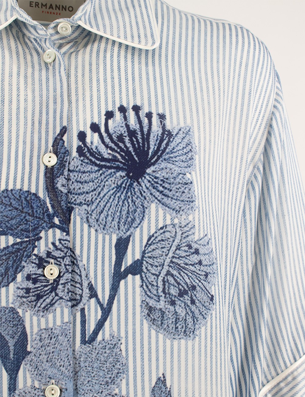 Легка сукня-сорочка вільного крою поєднує в собі невимушену елегантність і сучасний комфорт. Вертикальна смужка візуально витягує силует, а акцентний квітковий принт додає образу витонченості та художньої виразності. Класичний комір і застібка на ґудзики підкреслюють лаконічний характер моделі, тоді як укорочені рукави з м’якими манжетами створюють легкий, розслаблений настрій.