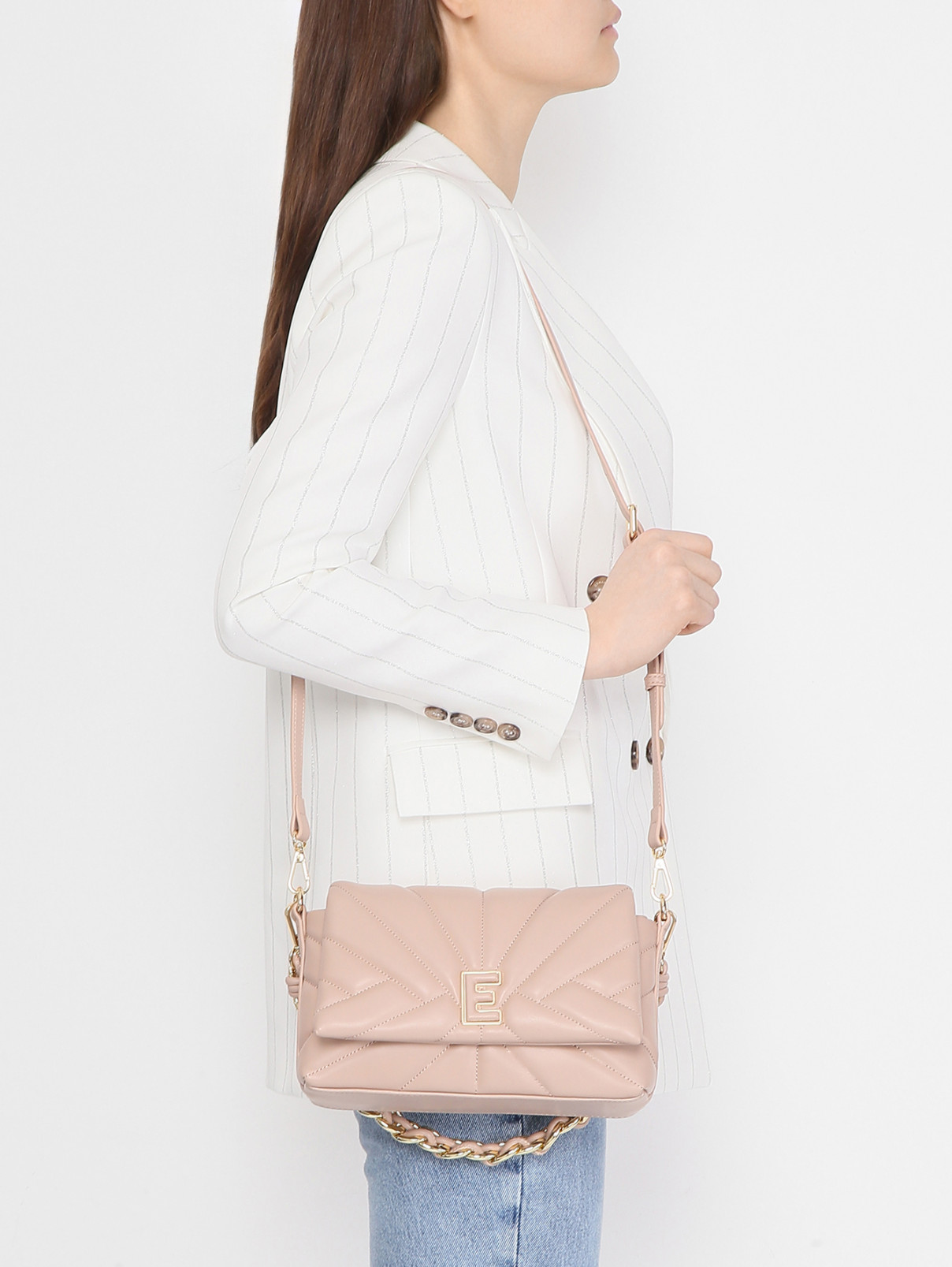 Модель з геометричною стьожкою, яка додає текстурності та стилю. Акцентна металева літера Е на клапані підкреслює фірмовий стиль бренду. Масивний плетений ремінець з поєднанням ланцюжка і шкіряних вставок робить аксесуар ще більш виразним. Розмір:25х16,5х7