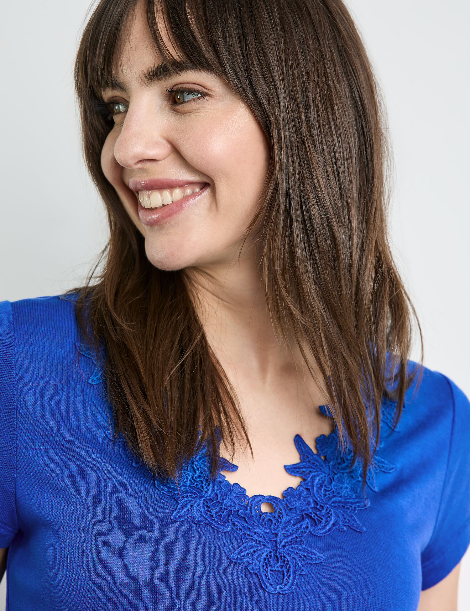 Футболка з віскози має V-подібний виріз, який прикрашений мереживом.