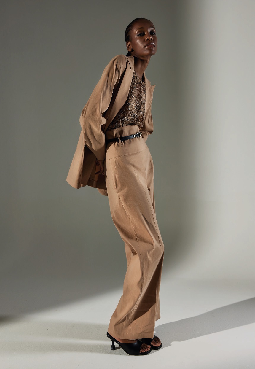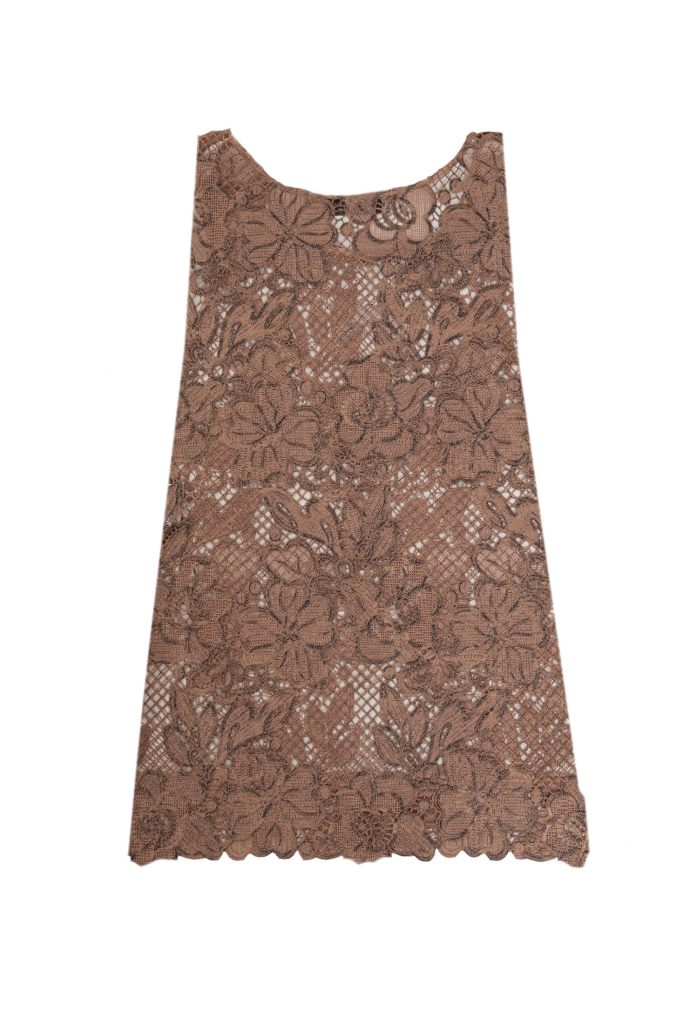 Топ виконаний із мережива та прикрашений великим квітковим візерунком, що надає образу глибини та фактурності. Безрукавний фасон і напівпрозора структура роблять топ легким і повітряним — ідеальним для літніх вечорів чи особливих подій.