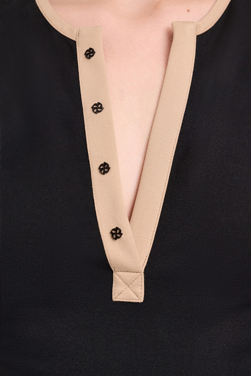 Топ в улюбленому Punto Milano з контрастним оздобленням та декоративною фурнітурою у вигляді D-троянди. Має відкритий круглий виріз.