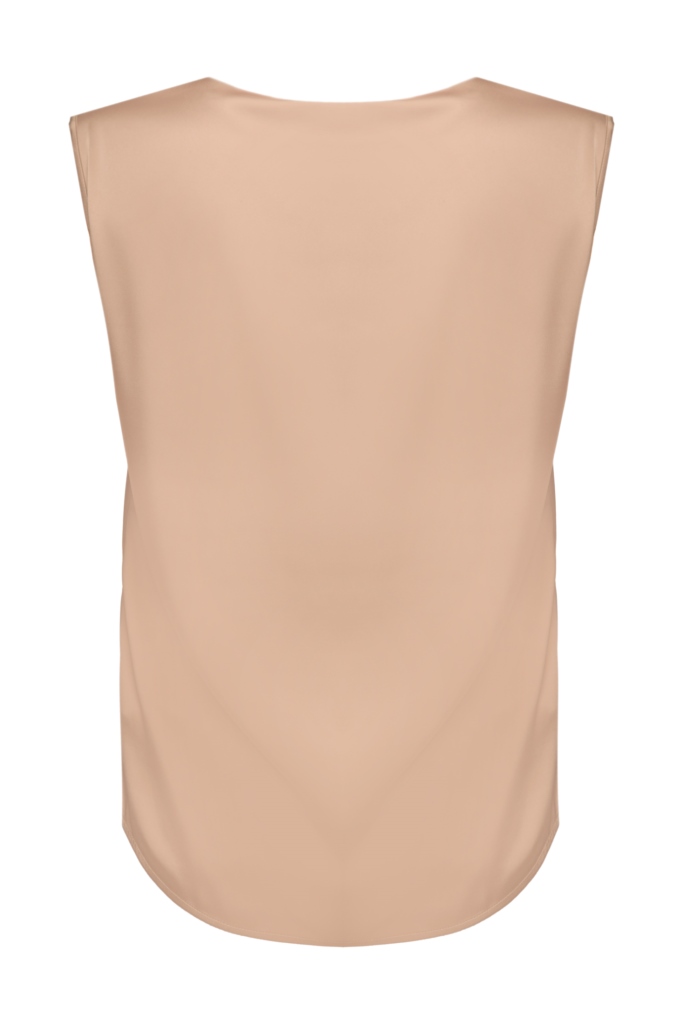 Топ має простий, але елегантний дизайн із округлим вирізом та широкими проймами. Модель відрізняється прямим кроєм та злегка подовженою спинкою.