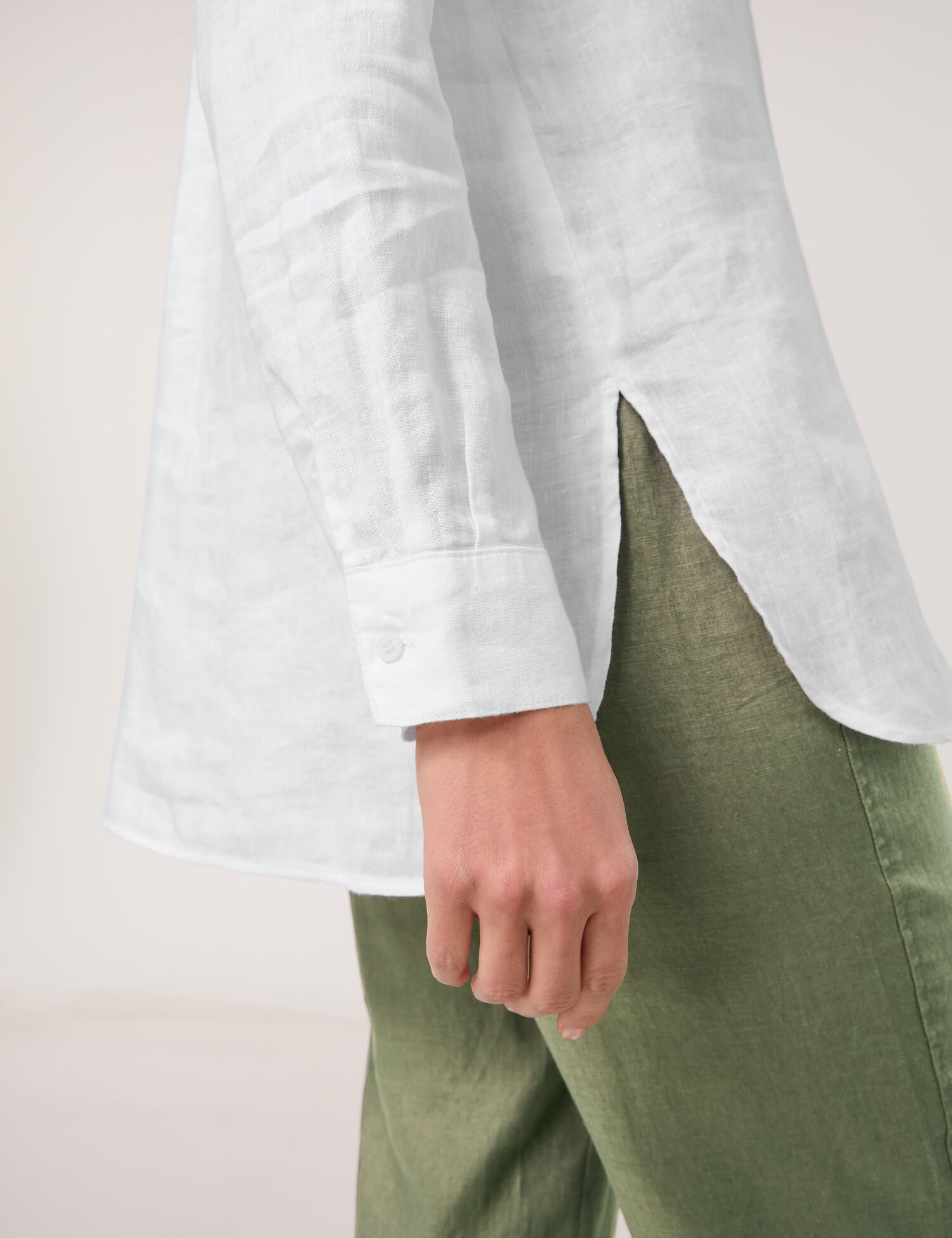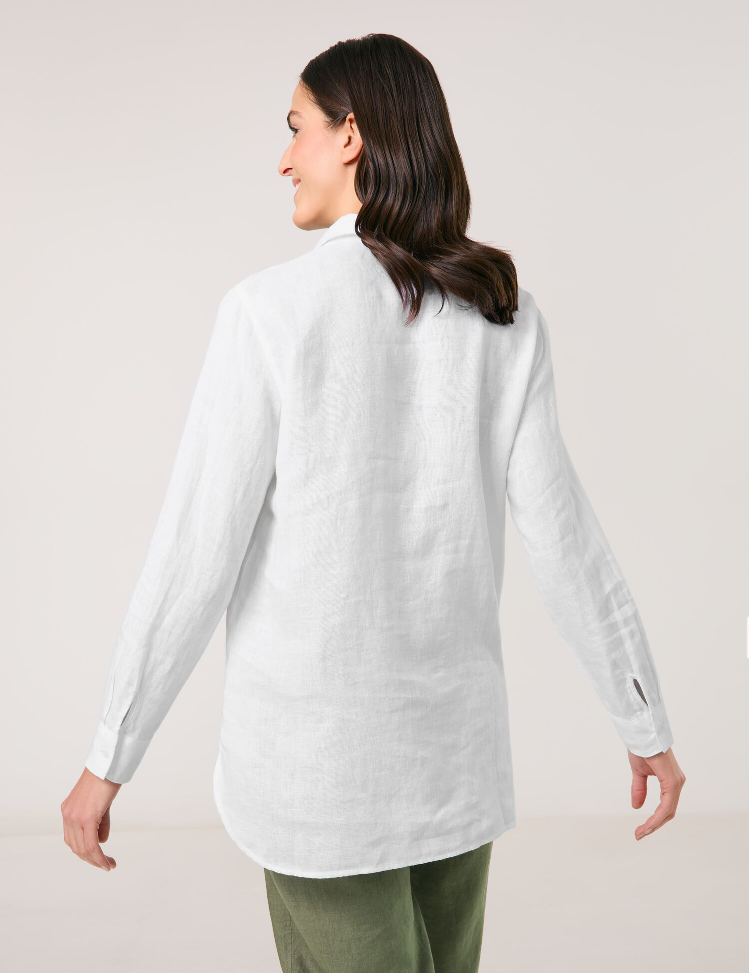 Ця проста довга блуза з чистого льону поєднує в собі позачасовий стиль і максимальний комфорт. Потайна застібка на ґудзики забезпечує елегантний вигляд, а злегка подовжена спинка та закруглений поділ створюють стрункий силует. Легка лляна тканина робить цю блузку ідеальним вибором для теплих днів - універсальна річ для будь-якого випадку.