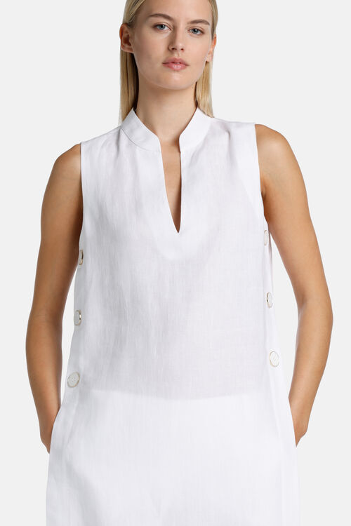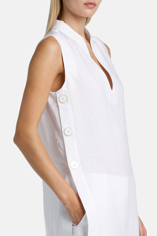 Туніка без рукавів з чистого льону. Комір-стійка, V-подібний виріз горловини, частково застібнуті на ґудзики бокові розрізи. Звичайний крій.