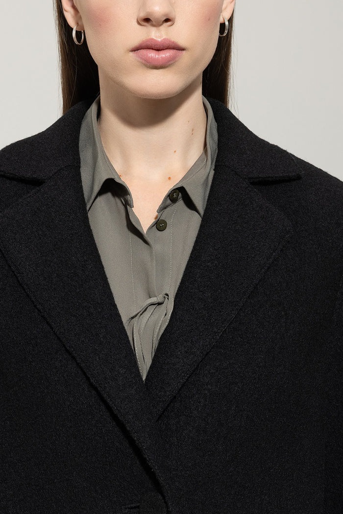 Коротке пальто-блейзер, виготовлене з високоякісної натуральної вовни. Пальто без підкладки має комір з лацканами, застібку на ґудзиках і бічні кишені з клапанами.