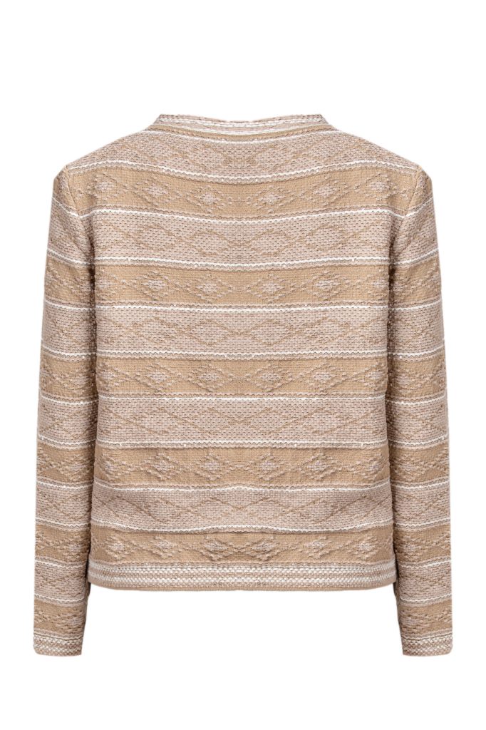 Трикотажний жакет з горізонтальним візерунком. Прямий силует, круглий виріз без коміра та декоративні гудзики додають виробу вишуканості. Невеликі накладні кишені з делікатною обробкою завершують образ.
