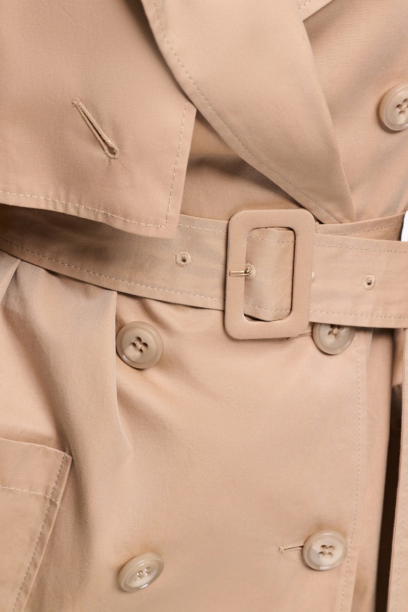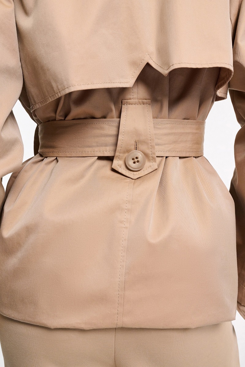 Тренч злегка приталеного силуету з регульованою довжиною та застібкою на блискавку на подолі. Класика верхнього одягу має деталі тренча та пояс з ременем.