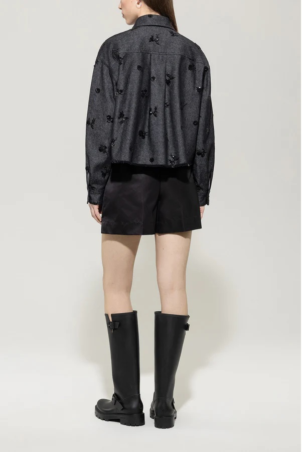 Жакет з джинсового деніму, що виполіскується, з витонченою вишивкою з паєток і застібкою на ґудзики по всій довжині. Дві накладні нагрудні кишені та відкритий поділ доповнюють дизайн.