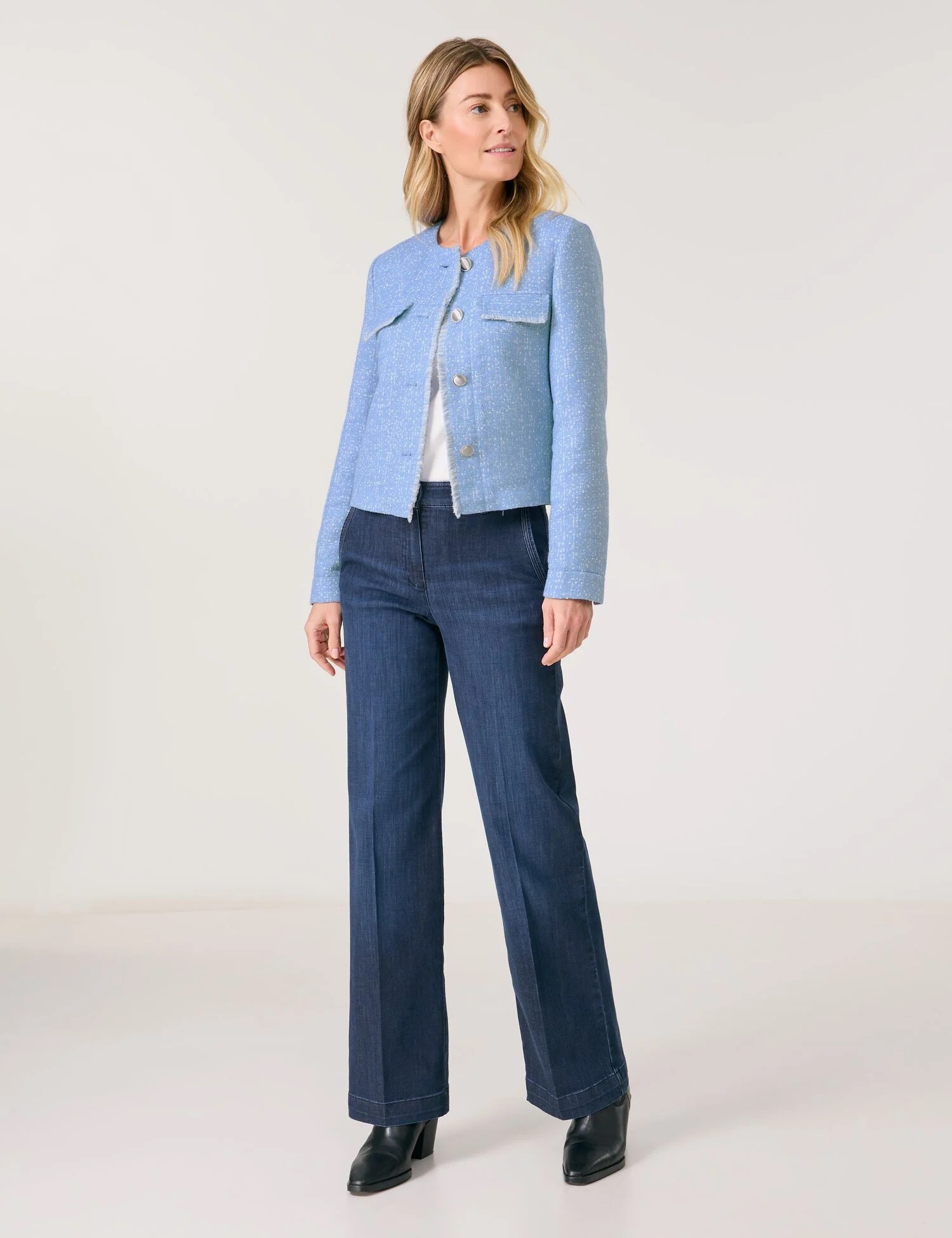 Елегантність у поєднанні з сучасним шиком: цей приталений піджак з високоякісної тканини під твід вражає своїм стильним дизайном. Бахрома на кокетці та кишенях з клапанами додає йому невимушеного стилю, а декоративні блискучі ґудзики розставляють елегантні акценти.