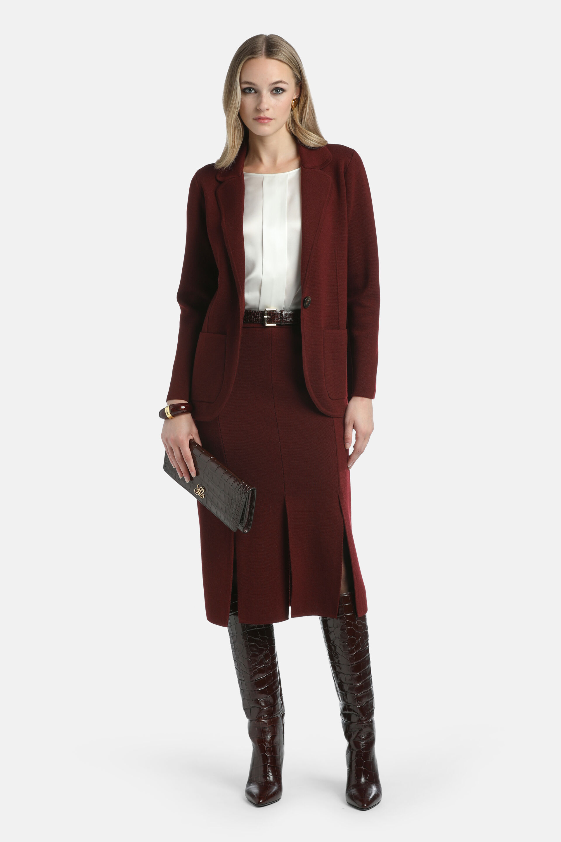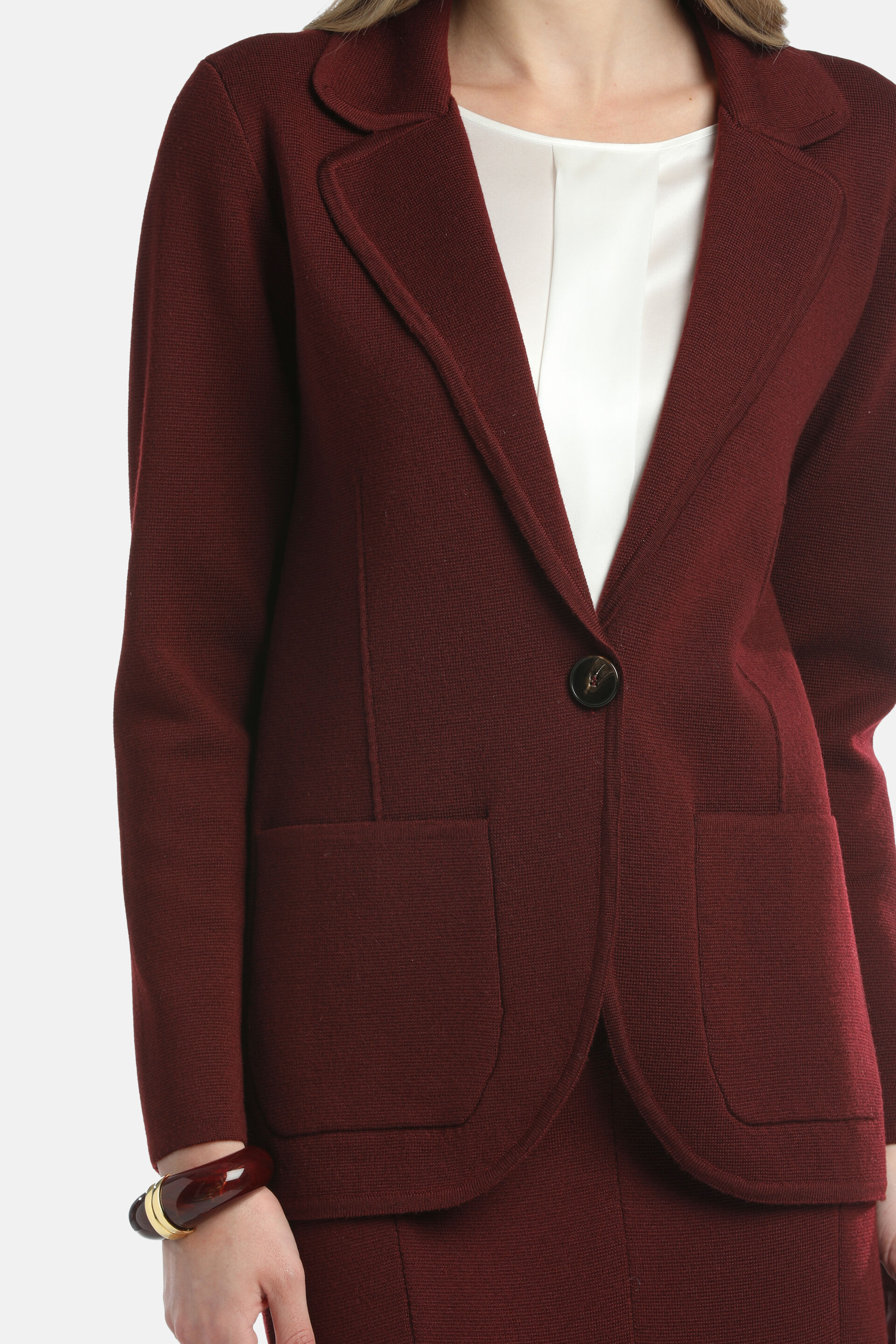 Жакет гладкої в'язки з чистої натуральної вовни. Має лацкани з вирізом, однобортну застібку, виражені шви та накладні кишені. Класичний крій.