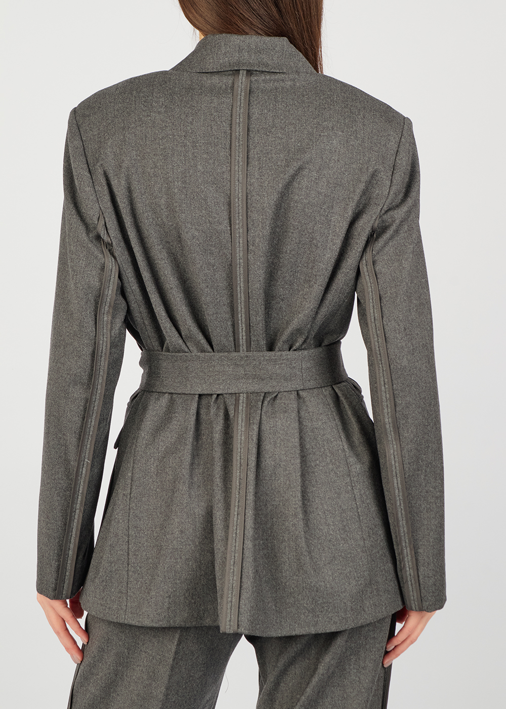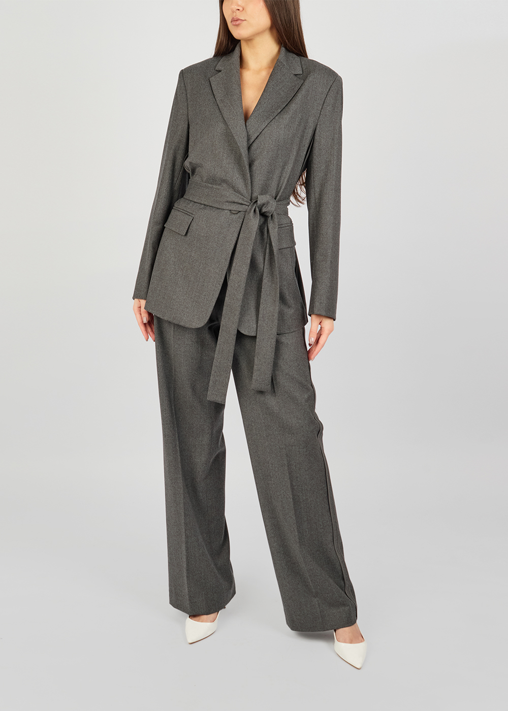 Елегантний вовняний жакет із м’якої теплої тканини, виконаний у сучасному мінімалістичному стилі. Модель має прямий силует із класичними лацканами та акцентованим поясом, який підкреслює талію та додає образу витонченості. Комфортні та елегантні брюки, виконані з м’якої якісної вовни. Модель має вільний силует, еластичний пояс на резинці та легкі складки спереду, що забезпечують зручну посадку й додають образу невимушеної елегантності.