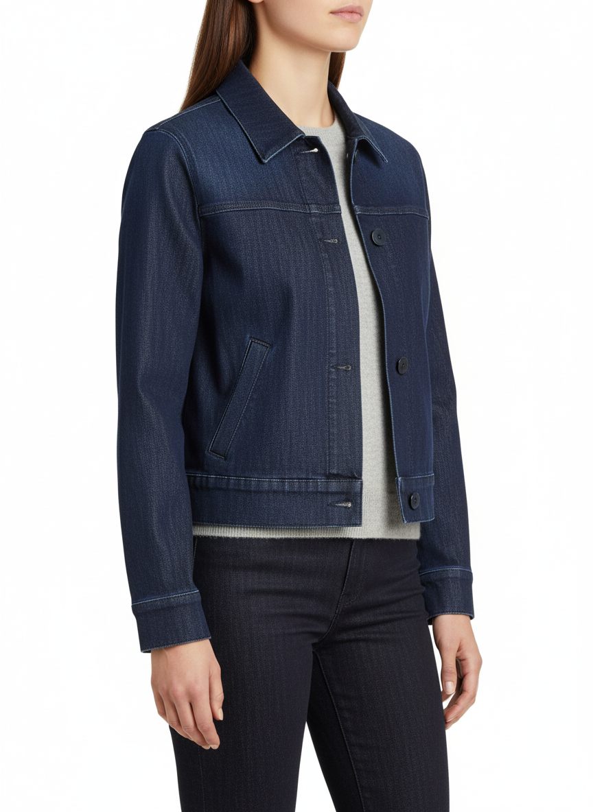 Класичний джинсовий жакет із застібкою на ґудзики. Виконаний із темно-синього деніму, має накладні кишені та прямий силует. Стильна базова модель, яка легко поєднується з брюками, сукнями чи спідницями, додаючи образу сучасності та невимушеності.