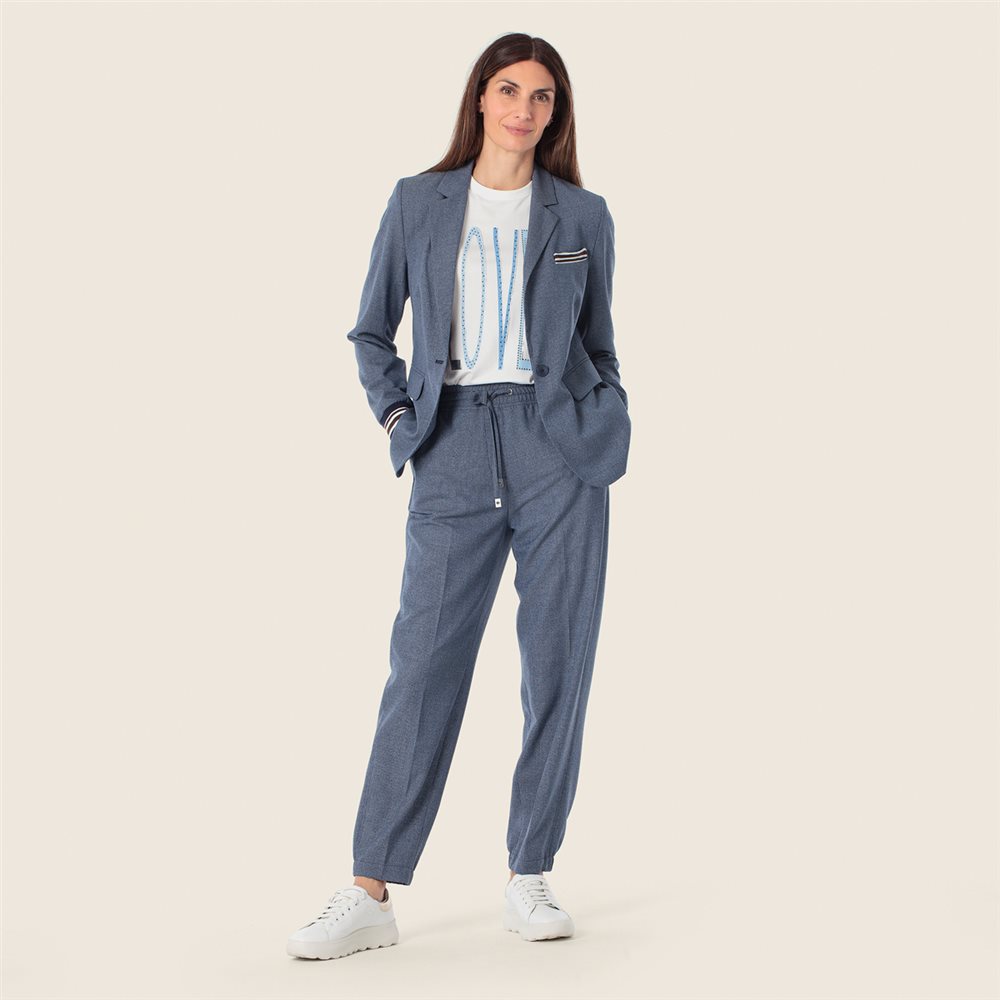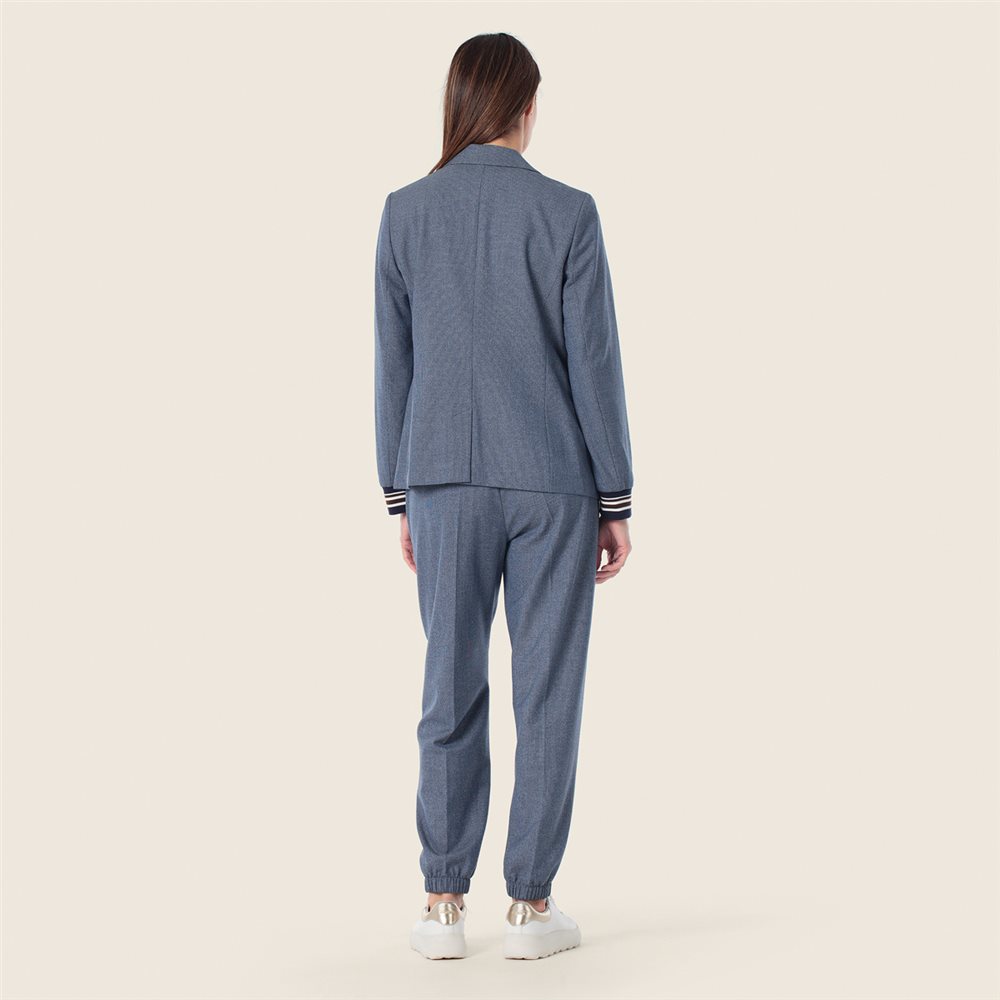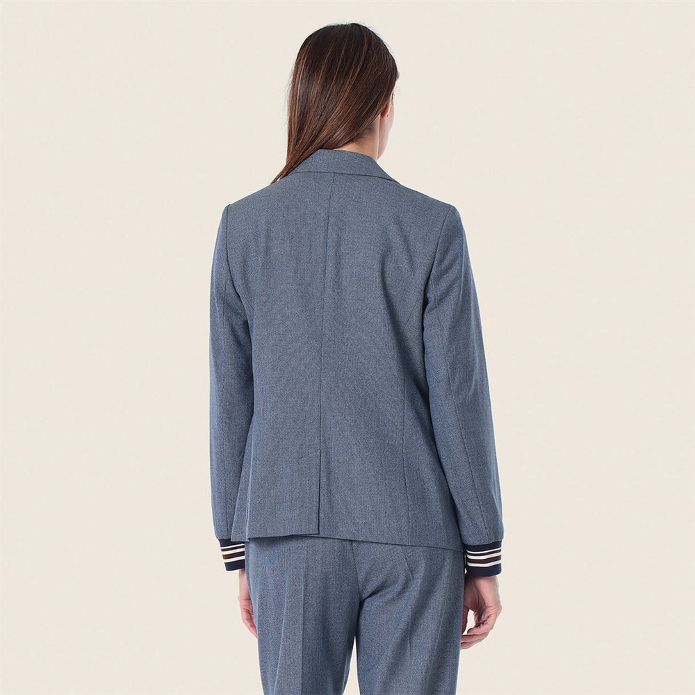 Елегантний жакет у стриманому блакитно-сірому відтінку — ідеальна база для сучасного гардероба. Лаконічний крій з класичним коміром, акуратною застібкою на ґудзики та декоративними контрастними деталями на манжетах додає образу витонченості.