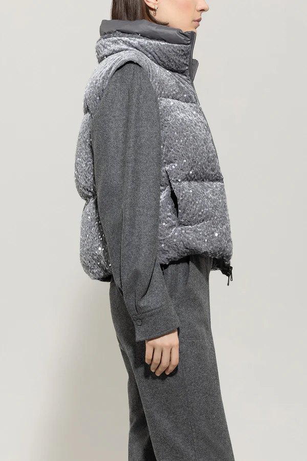 Теплий жилет із коміром-стійкою, двосторонньою блискавкою, бічними кишенями та регульованим шнурком на подолі. Зовнішній матеріал із оксамиту з прозорими паєтками додає додаткової дози гламуру.