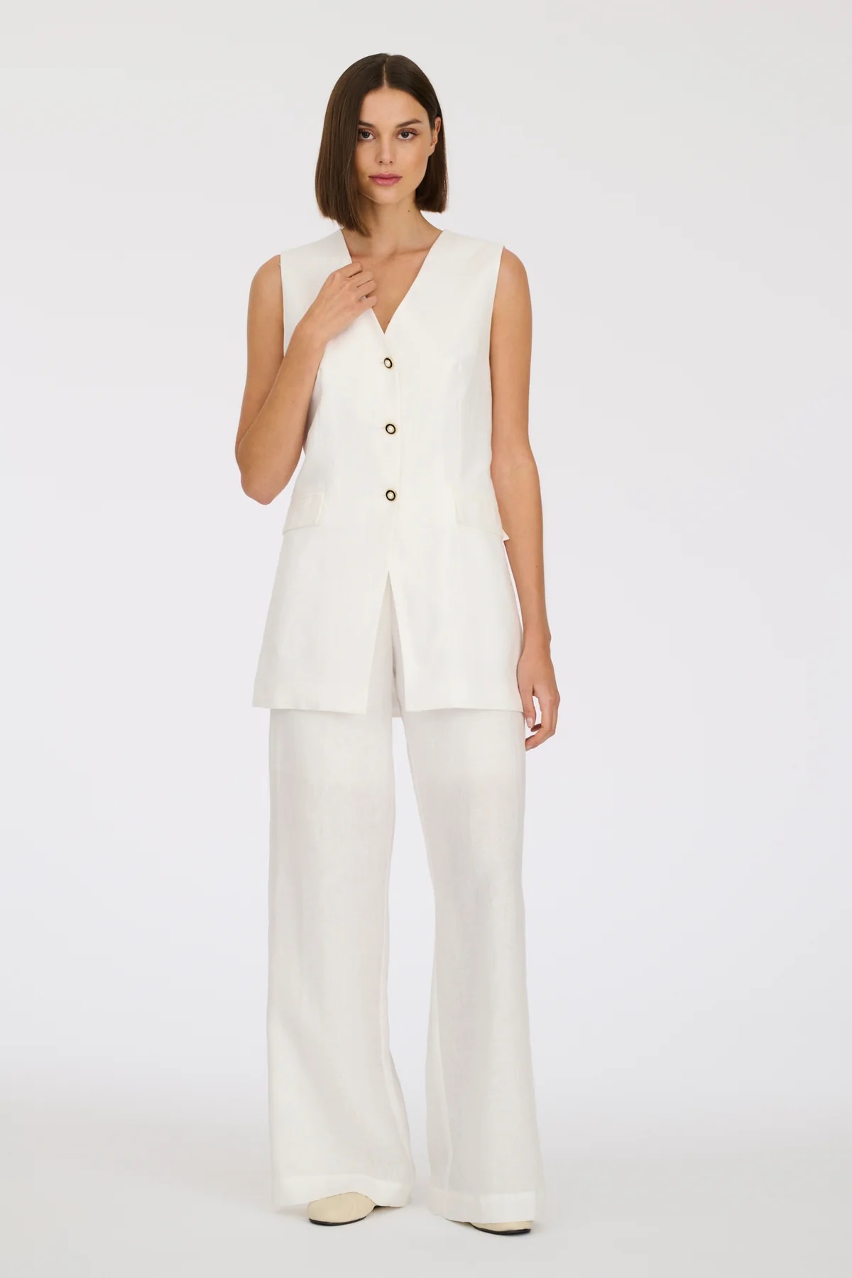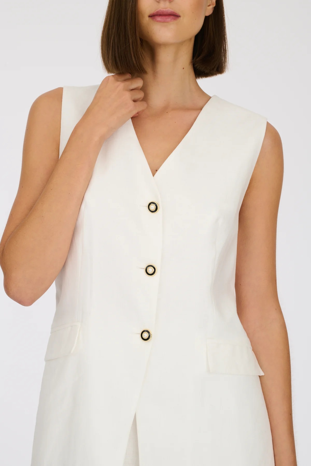 Лляна жилетка, оздоблена ювелірними ґудзиками Weill. Має V-подібний виріз, дві кишені з клапанами, розріз ззаду та підкладку.