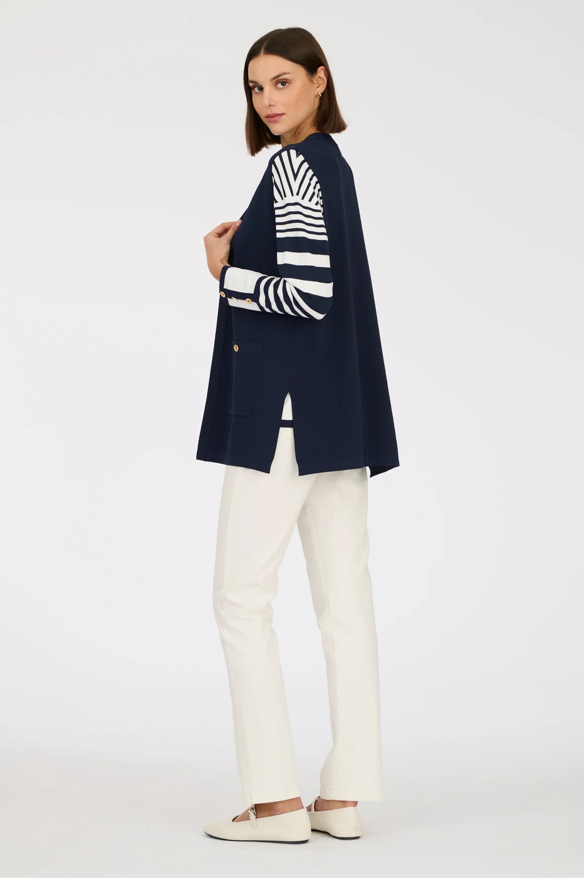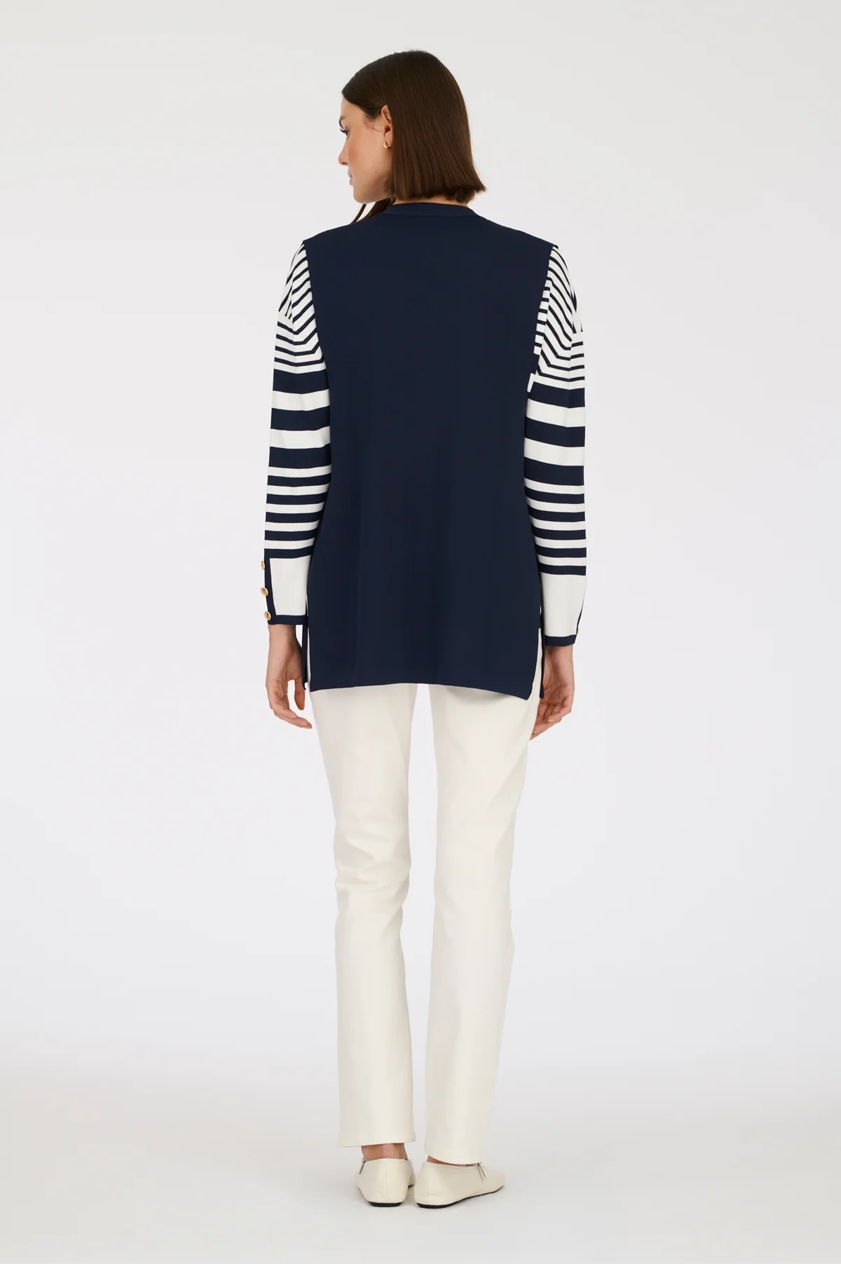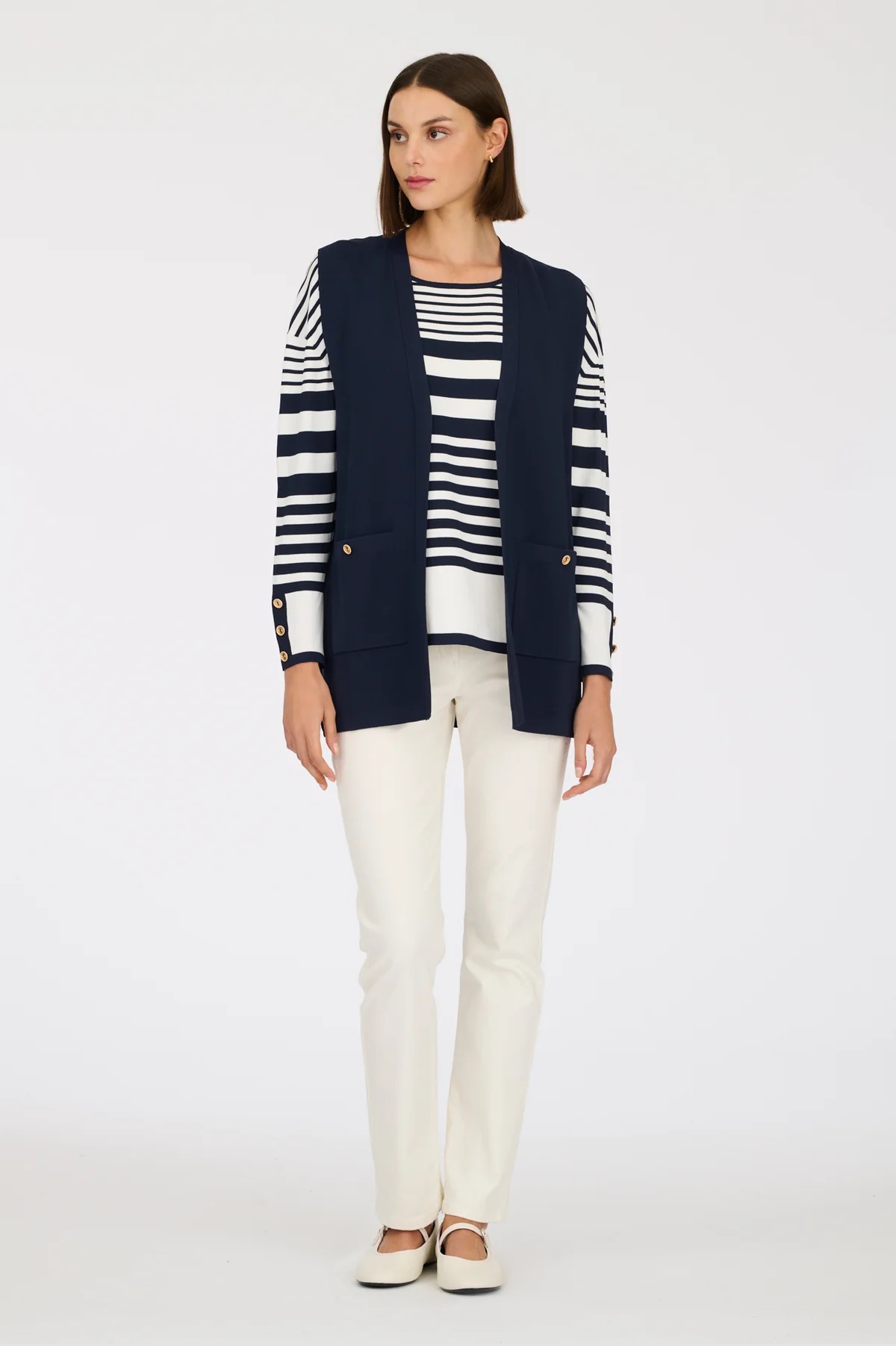 Трикотажний жилет середньої довжини з ґудзиками Weill. Модель має V-подібний виріз, дві накладні кишені, два бічні розрізи внизу.