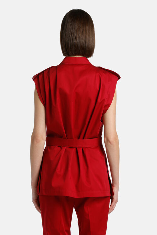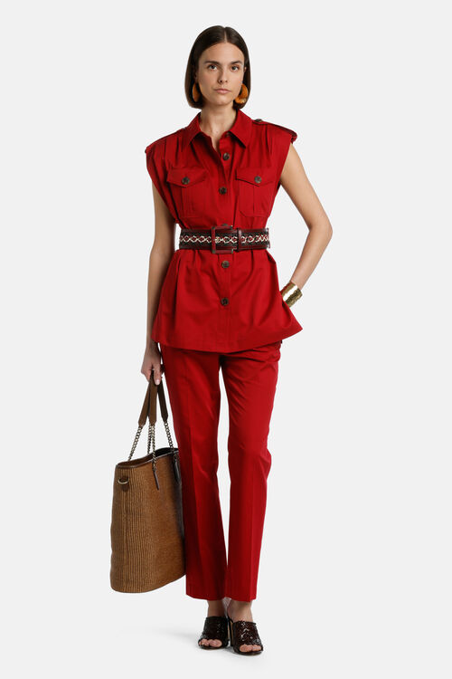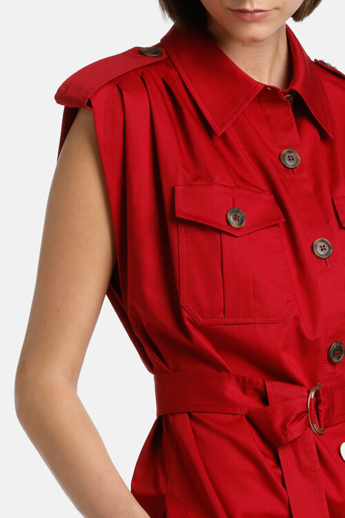 Сафарі-жилет з чистої бавовни. З емблемами на плечах, прорізними кишенями з клапанами, контрастними ґудзиками та поясом з тканини в тон.